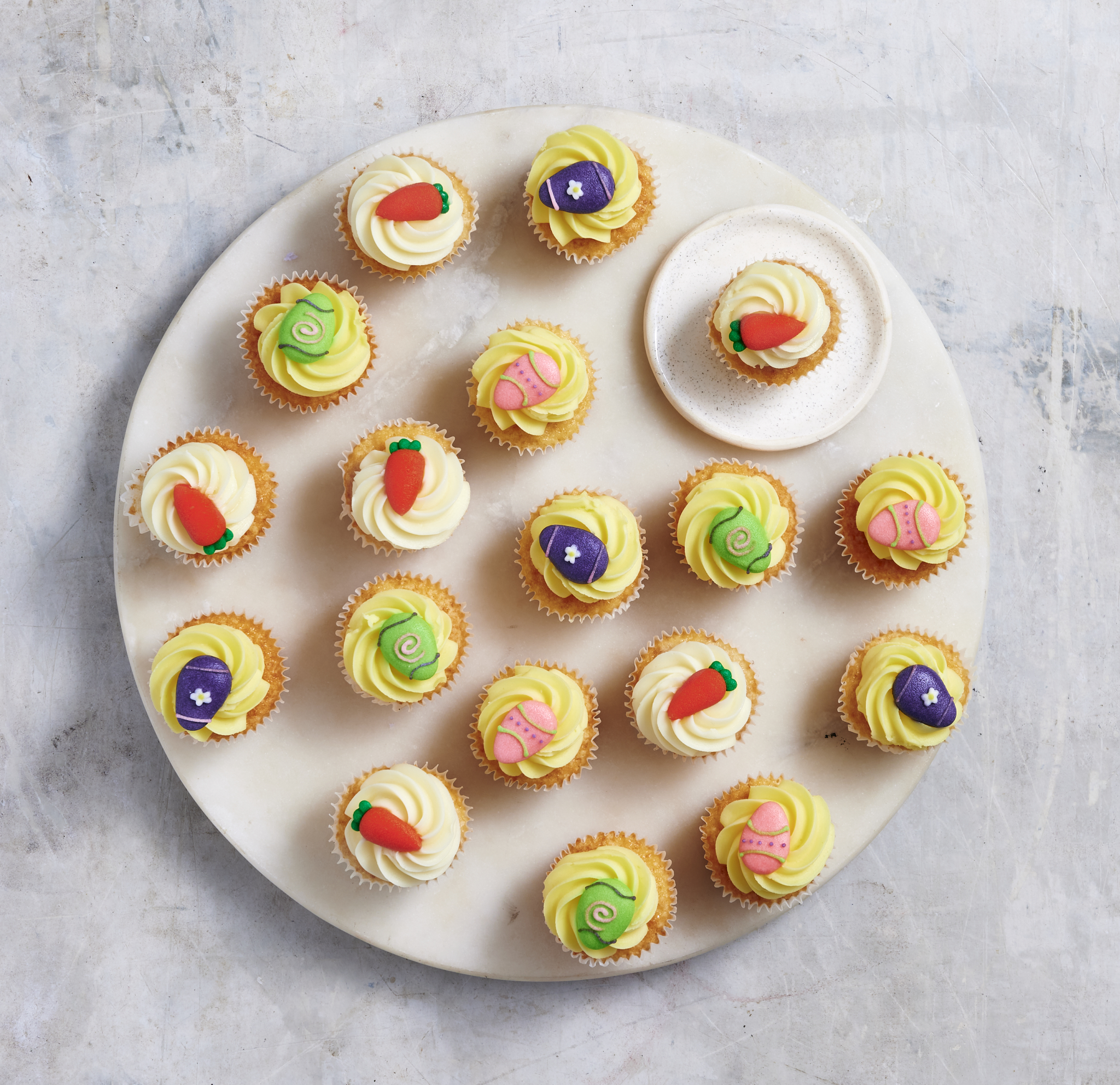 Festive vanilla babycakes topped with pastel buttercream and finished with a cute Easter themed trinket – the perfect little treat to spread some joy this Easter!